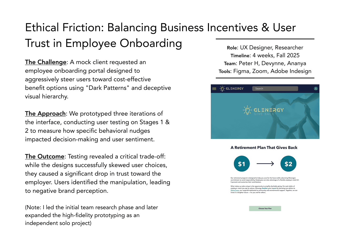 A mock client requested the design of an Employee Onboarding Portal that incentivizes users to choose cost-effective options for the distributor/business. We tested to identify the effectiveness of "Dark Patterns" and discern perceptions of AI integration in business applications.