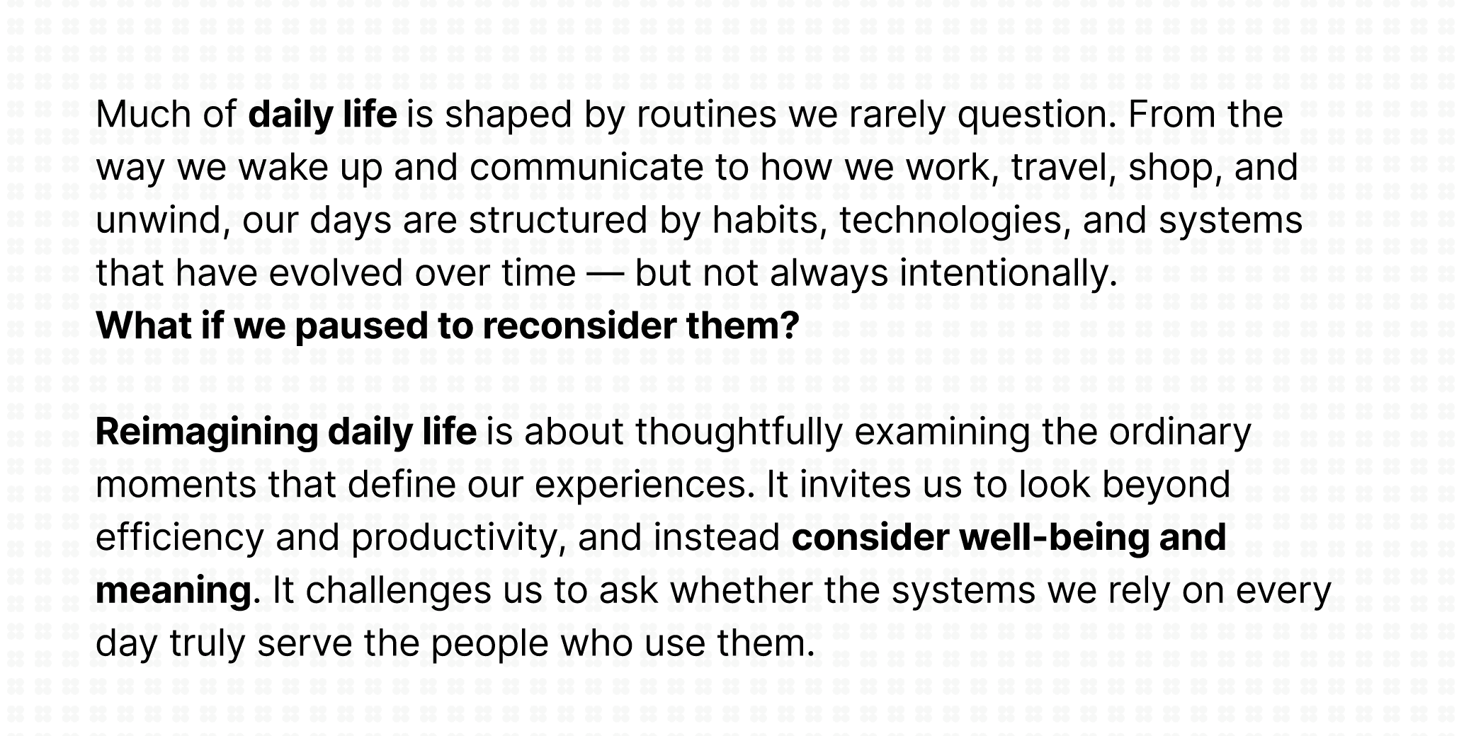 Reimagining daily life is about thoughtfully examining the ordinary moments that define our experiences. It invites us to look beyond efficiency and productivity, and instead consider well-being and meaning. It challenges us to ask whether the systems we rely on every day truly serve the people who use them.