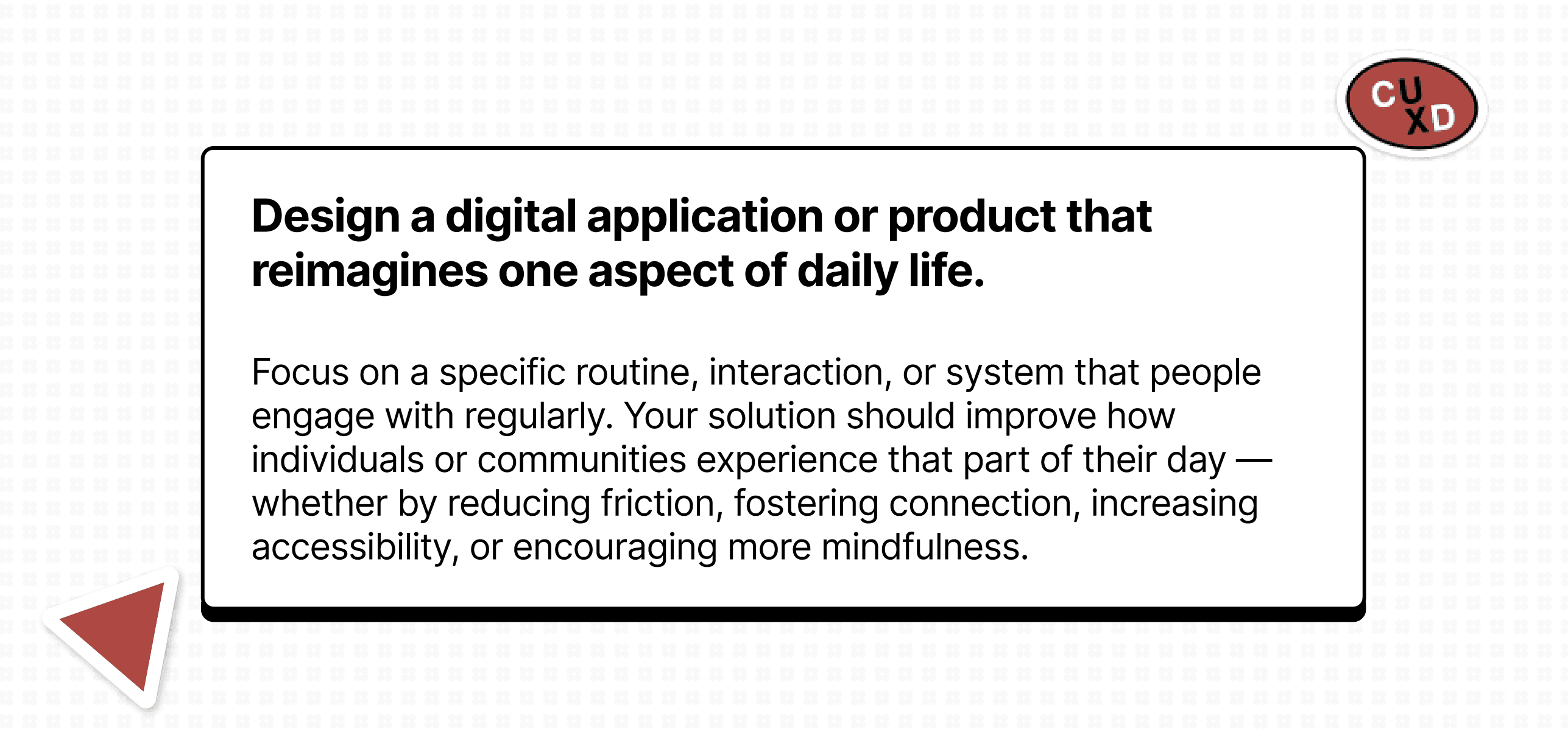 Focus on a specific routine, interaction, or system that people engage with regularly. Your solution should improve how individuals or communities experience that part of their day — whether by reducing friction, fostering connection, increasing accessibility, or encouraging more mindfulness.