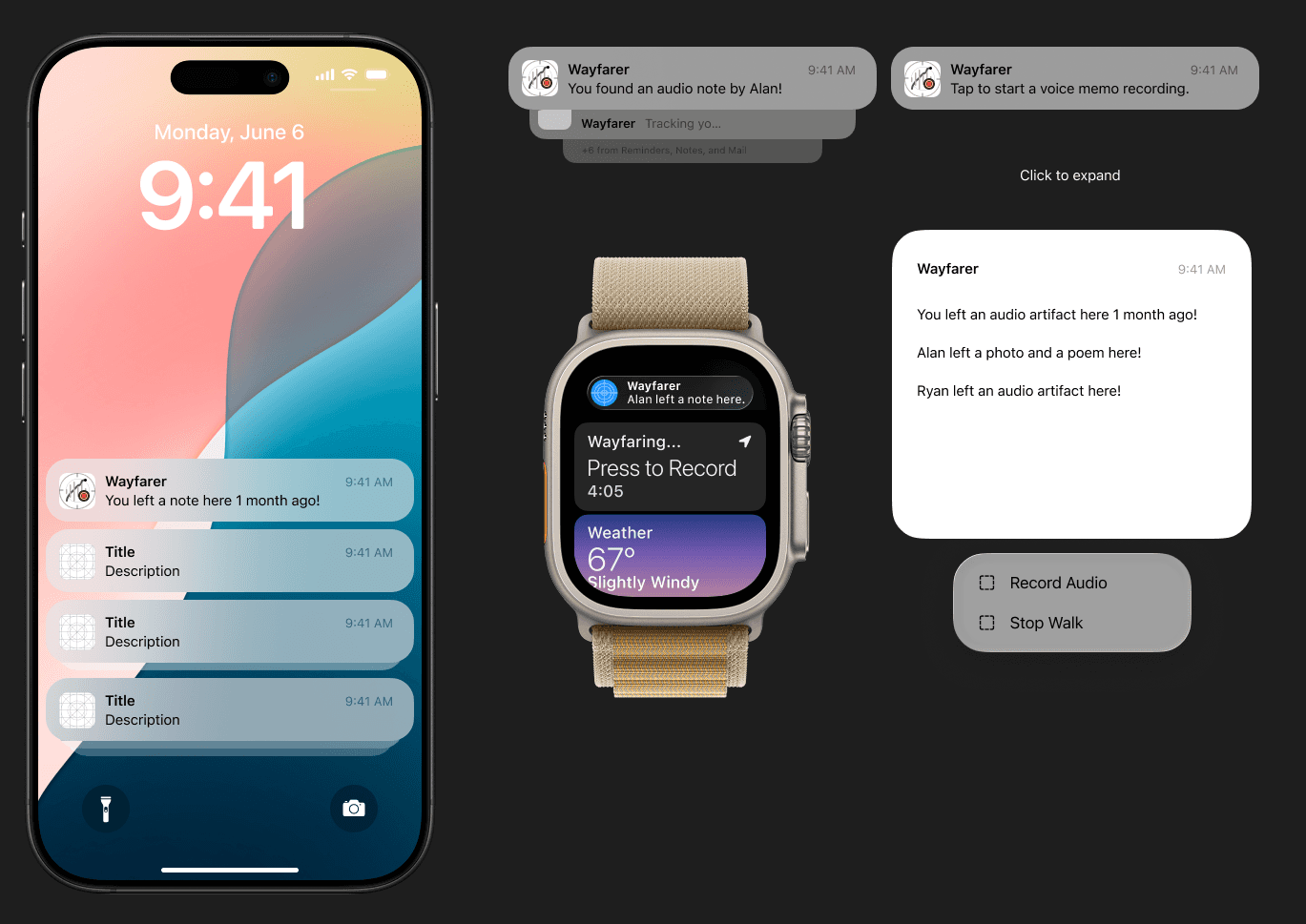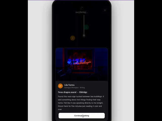 Cornell University CU Design-a-thon 2026 Winner! Two-day design sprint. 71 participants. An app designed to accompany you on your walk. Asynchronous social connection and easy access to journaling. Wayfarer's mission is to bring people together, to build a more connected culture through reflection, observation, and presence.